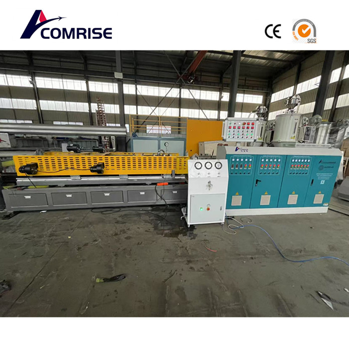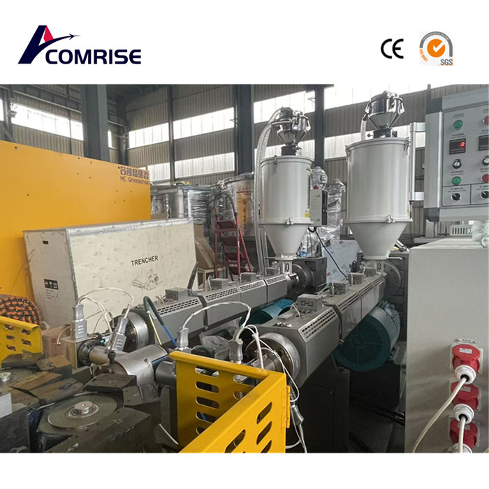 Extrudér pro výrobu potrubí s dvojitou stěnou zkrutovaného potrubí se skládá ze šroubové tyče, válce, reduktoru, rámu hlavy extrudéru, vodovodního a vzduchového chladicího systému, mazacího systému, systému řízení teploty, převodovkou atd. Všechny části jsou vyráběny známými výrobci a známými dodavateli.
