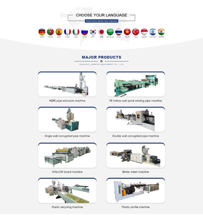 Máme také mnoho produktů, jako je výrobní linka PE potrubí, výrobní potrubí PVC, výrobní linka profilu, výrobní linka granulace, linka pro výrobu listů atd. Můžete si vybrat z různých produktů.